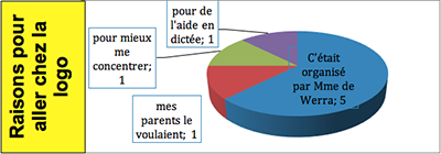 Ces cinq stages s’organisaient sur trois ou quatre séances durant la pause de midi. Les thèmes abordés étaient : - l’apprentissage du vocabulaire, - la dictée, - les homophones, - la compréhension écrite - les nouvelles technologies. Les élèves qui n’étaient plus suivis par une logopédiste en extra-scolaire étaient tenus de s’inscrire à trois stages minimum, suivant leurs difficultés et leur intérêt personnels. Les appuis donnés depuis la rentrée 2014 étaient alors davantage « scolaires » et moins « thérapeutiques » qu’avant. Cependant, le groupe COSOdys restait un lieu d’échange de stratégie, de discussion et d’écoute, même si les élèves arrivaient avec peu de questions personnelles. |