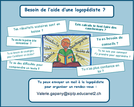 - Ils pourraient suggérer à l’élève « dys » d’aller demander de l’aide de la logopédiste lorsqu’ils jugent que cela est nécessaire (pour des préparations ou corrections de dictée, de l’aide lors d’une lecture suivie, des conseils pour l’apprentissage du vocabulaire, etc…)